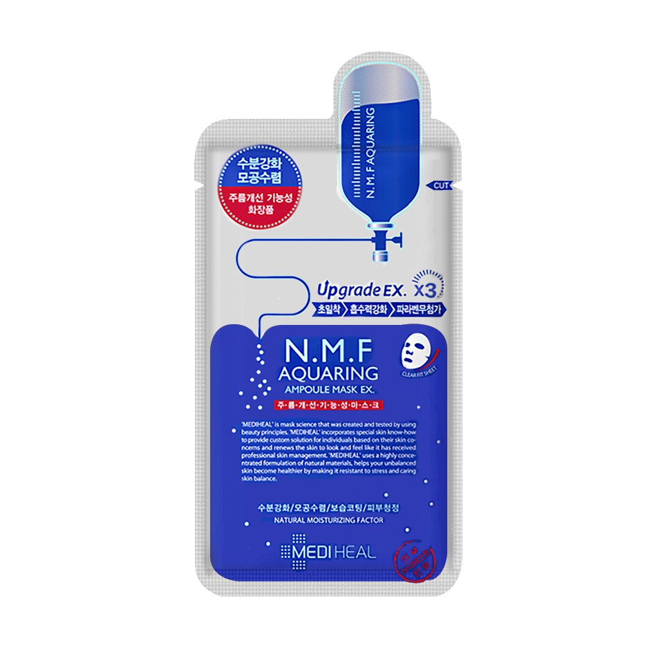 Aquaring ampoule mask uses n.m.f (natural moisture factor) that helps provide and instantly moisturizing the skin. The thirst of dry skin is resolved through active water more more systems such as hyaluronic acid, ceramide, and more excelling in the n.m.f. Ingredients subject to change at manufacturer's discretion. Mediheal nmf aquaring ampoule mask ex 2 choices.